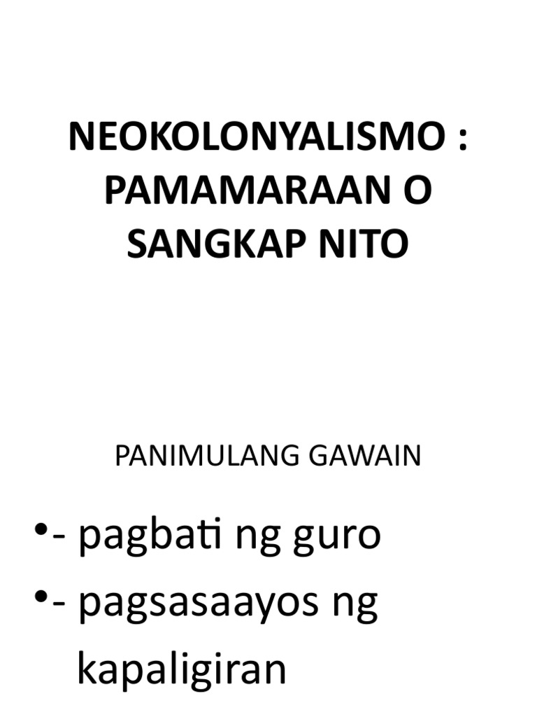 03062021 tawag sa bagong anyo ng kolonyalismo na patuloy na nagtataguyod mas makapangyarihang bansa ang - Brainlyph. Nalaman natin na ang Kolonyalismo pala ay isang paraan ng pananakop na ginagamitan ng dahas. Bunga ng Neo-Kolonyalismo Pagkatapos mong mapag-aralan ang modyul inaasahang magagawa mo ang mga sumusunod.