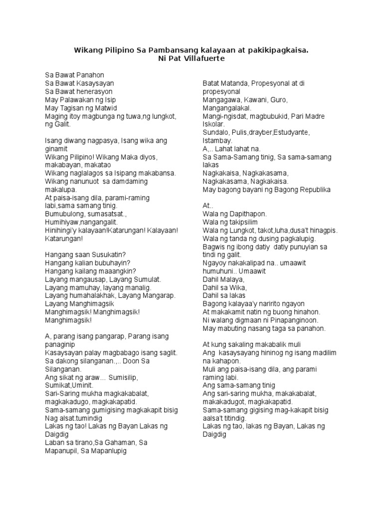 Wikang Pilipino Sa Pambansang Kalayaan At Pakikipagkaisa